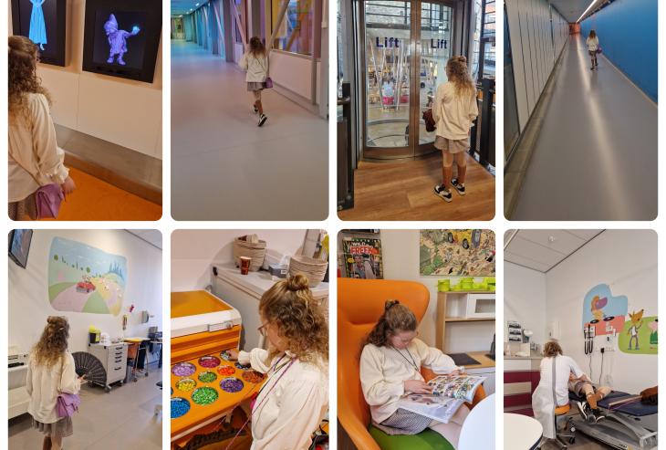 Daarna huppel je het Máxima in. In de hal hangen interactieve schermen met Sneeuwwitje en de dwergen. Jij stopt bij de laatste dwerg, naast Sneeuwwitje, in de hoop dat hij de diamant laat zien. Deze keer hebben wij geluk. Daarna huppel je verder door de gang, met je hand langs de muur, waar ‘de Maxies’ (een geprojecteerd beestje dat met je mee beweegt) als vanzelf jouw handen volgen. Je drukt op het knopje bij de lift en stapt uit op de tweede verdieping, waar jij je meldt bij de doktersassistent. Ik hoef niets te zeggen, als een geautomatiseerde piloot weet jij hoe het gaat en wijs jij de weg.