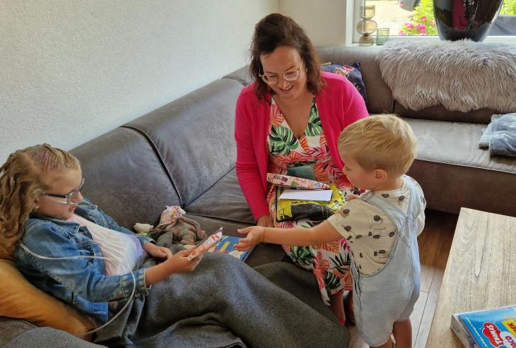 Bij veel gezinnen is dat een reden om de verjaardag uit te stellen. Bij Nina niet. We kijken de situatie aan en pas als het echt niet gaat, zeggen we alles af. Want de onduidelijkheid of haar verjaardag wel of niet doorgaat geeft haar zoveel stress. Dat is niet bevorderend voor haar gezondheid. Gelukkig kon zij met behulp van de zuurstof en heel veel paracetamol haar verjaardag vieren. En wat heeft ze genoten! Het was mooi weer, dus de visite kon lekker in de tuin zitten. In de woonkamer zat onze jarige job met één van de oma’s, soms een lieve tante of iemand anders. Lekker rustig, weg van de drukte, maar wel als stralend middelpunt. Al hielpen die koortswangen daar ook wel bij.