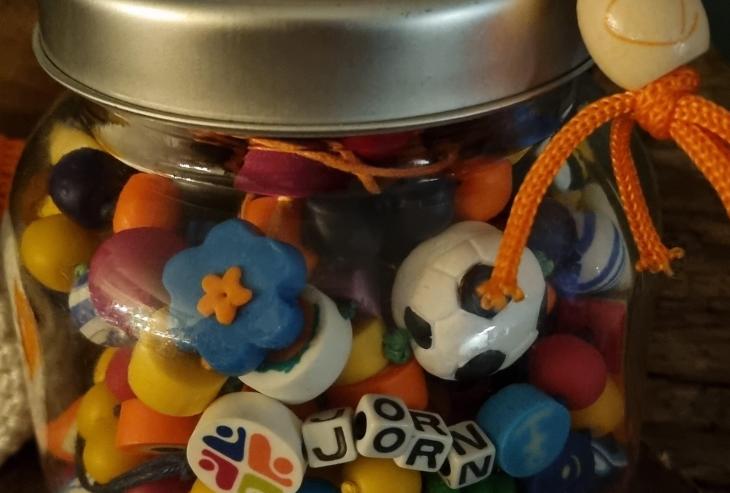 Ondertussen zijn we drie jaar verder en is Jorn schoon! Uiteindelijk zijn we heel erg blij dat we zijn begonnen met de Kanjerketting die wij gelukkig hebben mogen afsluiten met de bloemenkraal. De ketting is waardevol voor ons allemaal omdat het ons eigen verhaal vertelt. Gelukkig is het verhaal goed afgelopen, dus die benaming geluksketting is zo gek nog niet. Lang heeft de ketting in het opbergzakje gezeten zodat we hem altijd gemakkelijk konden meenemen en uitpakken om uitleg te geven. Nu staat het kleurrijke geheel in een mooie pot op de kast zodat we elke dag zien en beseffen hoe gezegend we zijn met ons vijven!